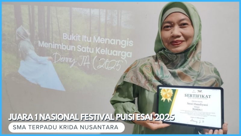 Seni Handiyani, S.Pd., guru SMA Terpadu Krida Nusantara, menorehkan prestasi gemilang dengan meraih Juara 1 tingkat nasional dalam Festival Puisi Esai 2025 yang digelar oleh Denny J.A. Foundation. Dalam...