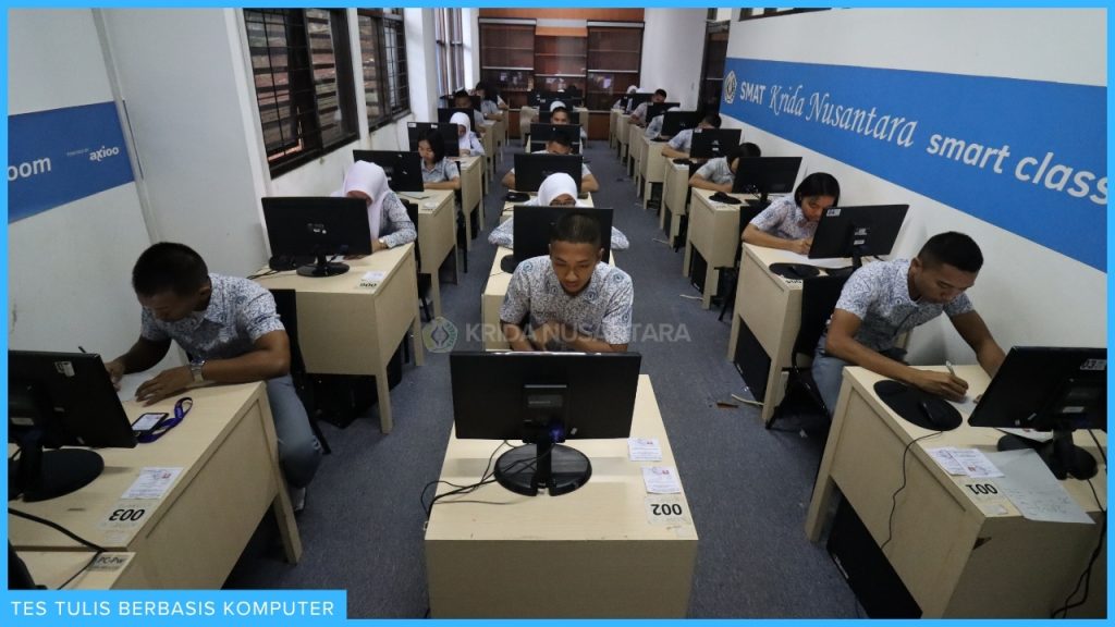 Selanjutnya, tes tulis berbasis komputer dilaksanakan pada 2 – 10 Maret 2026 dengan mata ujian adalah seluruh mata pelajaran yang diampu murid di kelas XII. Pelaksanaan ujian berlangsung di 9 ruangan Smart Class Krida Nusantara dan dilakukan dengan model Computer Based Test (CBT) dengan menggunakan Learning Management System (LMS) SMA Terpadu Krida Nusantara.